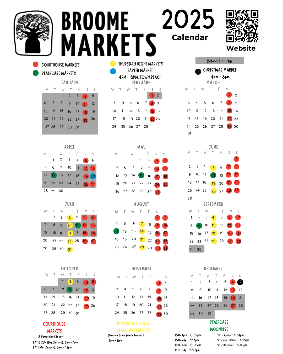From the bustling Saturday scene to laid-back Sunday mornings, magical Staircase nights, and Thursday evenings under the lights — here’s what’s on at the Broome Markets.